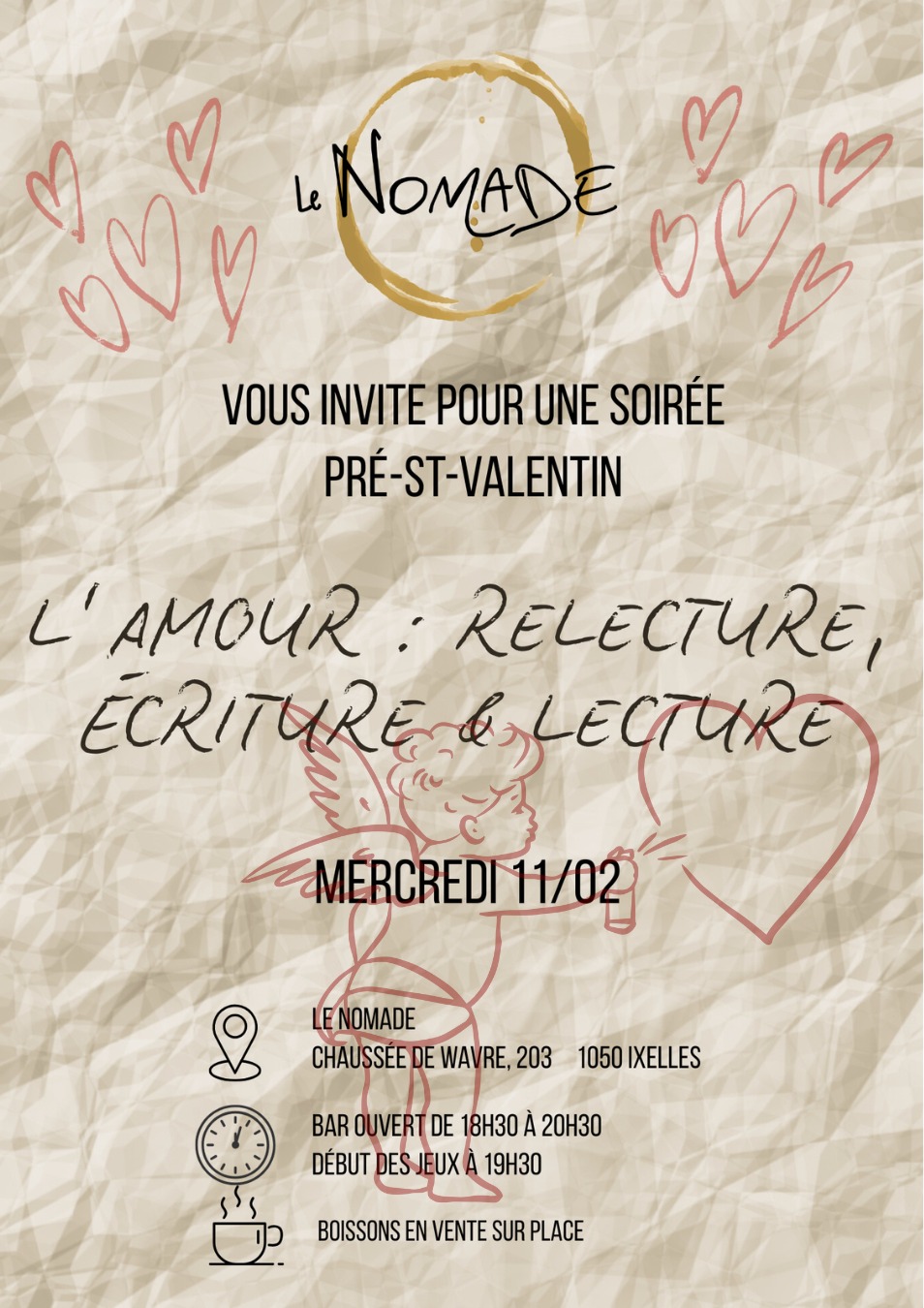 Le Nomade est ouvert tous les lundis de 19h00 à 22h00 et tous les mercredis de 18h30 à 21h30 : soyez les bienvenus pour discuter, taper la carte, lire un livre ou boire un verre !